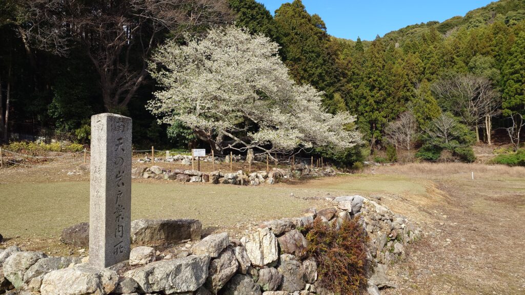 天の岩戸の道中に樹齢360年以上の一本桜、大島桜(おおしまざくら)「岩戸桜」があり、